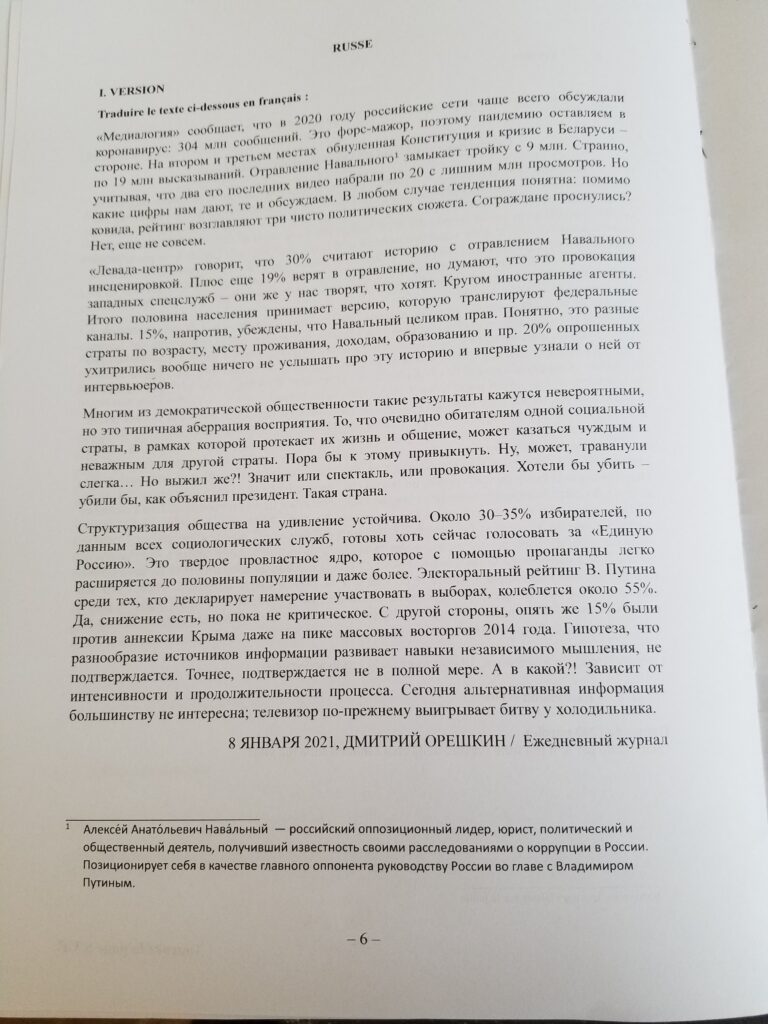 4) entretien avec le jury, lors duquel ce dernier pourra revenir sur un ou plusieurs points de l’exposé du candidat, l’interroger sur le texte ou élargir à des questions plus générales portant sur les pays de langue russe.
